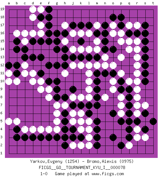 Last move : 1-0 2018 December 6 0:32:46 [Event "FICGS__GO__TOURNAMENT_KYU_I__000078"] [Site "FICGS"] [Date "2018.05.21"] [Round "1"] [Black "Yarkov,Evgeny"] [White "Bromo,Alexis"] [Result "1-0"] [Rating 1 "1254"] [Rating 2 "0975"] 1.q16 d4 2.q4 d16 3.j17 k4 4.h3 d10 5.d13 c12 6.c13 e14 7.e13 f13 8.f12 g13 9.g12 h13 10.h5 q10 11.f10 e9 12.f17 e17 13.f16 e16 14.f15 f14 15.e15 d14 16.d15 c15 17.c14 c16 18.b15 b16 19.h12 j12 20.j13 j14 21.k13 k14 22.h14 h15 23.g14 l14 24.c3 c4 25.d3 e4 26.e3 f4 27.m4 l5 28.m5 l4 29.n16 m15 30.m16 l16 31.l17 k16 32.m3 l3 33.m2 l2 34.f3 g5 35.h6 g6 36.l6 k6 37.m7 n8 38.k7 j6 39.j7 j5 40.j4 k5 41.k3 k2 42.j3 j2 43.h2 h7 44.h4 g4 45.g3 j8 46.h8 g7 47.g8 f8 48.j9 k8 49.l7 l8 50.m8 l9 51.m9 l10 52.m10 l11 53.m11 l12 54.l13 m12 55.m13 n12 56.n11 o12 57.n15 m14 58.n14 n13 59.k17 j16 60.h16 h17 61.g16 k12 62.h13 h11 63.q8 r9 64.q6 r3 65.q3 r4 66.r5 s5 67.s6 q2 68.p2 r7 69.s4 s3 70.t5 s7 71.q7 r8 72.r16 q14 73.s14 r13 74.g9 f9 75.g10 e10 76.b4 b5 77.b3 a5 78.b12 c11 79.b11 b10 80.e18 d18 81.f18 e19 82.s12 r12 83.s11 r11 84.s10 r10 85.s13 r14 86.e11 d11 87.o14 p13 88.p9 o9 89.p10 o10 90.o11 p11 91.b14 a11 92.a12 a10 93.f19 d19 94.o3 r15 95.s15 p15 96.g15 p16 97.p17 o17 98.k15 m17 99.n17 o16 100.o18 q17 101.p18 r17 102.s17 q15 103.s16 p8 104.q9 p7 105.o6 p6 106.p5 r6 107.q5 1-0 This go game has been lost on time (started : 2018.05.21 11:47:3) Here are the names of the openings (joseki) played in the four corners : Corner d16 : d16 j17 Hoshi (Hwajeom, Seongjeom, Xingwei`) 4-4 Point. The star or hoshi (4-4) point, emphasizing influence at the potential expense of territory. Corner d4 : d4 h3 Hoshi (Hwajeom, Seongjeom, Xingwei`) 4-4 Point. The star or hoshi (4-4) point, emphasizing influence at the potential expense of territory. Corner q16 : q16 l14 Hoshi (Hwajeom, Seongjeom, Xingwei`) 4-4 Point. The star or hoshi (4-4) point, emphasizing influence at the potential expense of territory. Player Black won this Go (weiqi, baduk) game. Follow this game move after move (download)One point in the center is worth ten in the corner. (Anonymous) The Internet is the first thing that humanity has build that humanity doesn't understand, the largest experiment in anarchy that we have ever had. (Eric Schmidt)