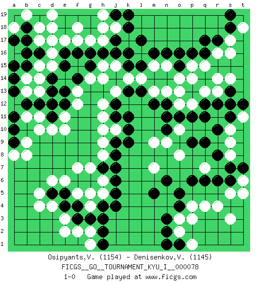 Last move : 1-0 2018 July 13 13:37:57 [Event "FICGS__GO__TOURNAMENT_KYU_I__000078"] [Site "FICGS"] [Date "2018.05.21"] [Round "1"] [Black "Osipyants,Vladimir"] [White "Denisenkov,Valentin"] [Result "1-0"] [Rating 1 "1154"] [Rating 2 "1145"] 1.q16 c4 2.d17 d15 3.f16 q4 4.j4 r14 5.q12 p14 6.o16 s16 7.r17 s12 8.q9 s17 9.s18 e3 10.n3 p3 11.r6 r4 12.p6 d10 13.d13 c13 14.c12 c14 15.d11 c10 16.b12 c17 17.c16 d16 18.b17 c18 19.b16 e17 20.b18 d18 21.a14 g17 22.l17 s9 23.r8 e11 24.e12 e10 25.f14 f17 26.g16 c11 27.d12 h11 28.g3 j13 29.g6 e6 30.k9 f12 31.d14 c15 32.e15 f13 33.b15 b13 34.a13 b14 35.e16 d17 36.h16 h17 37.j17 j18 38.k18 h18 39.k16 s5 40.s6 s3 41.o5 n15 42.n16 n13 43.n11 h9 44.j8 h8 45.j7 g7 46.f6 f7 47.e5 d6 48.f4 j15 49.j16 g14 50.d5 c5 51.a9 b9 52.a10 a8 53.a11 b8 54.k11 m15 55.m16 r16 56.q17 o3 57.n2 o2 58.m12 m13 59.l13 l14 60.k13 k14 61.n12 p12 62.p11 o12 63.o11 q13 64.q11 b19 65.c19 d19 66.j19 f18 67.o1 p1 68.n1 s8 69.p13 o13 70.s11 r11 71.r10 s10 72.r12 t11 73.s13 r13 74.t12 s14 75.s12 h19 76.k19 m7 77.m5 m9 78.j12 h12 79.j11 o8 80.n6 o10 81.n10 n9 82.p9 q7 83.q6 g2 84.h2 f2 85.f3 d4 86.e4 e2 87.h1 a18 88.a15 b11 89.a17 p15 90.p16 q15 91.e13 t6 92.t7 t5 93.s7 t18 94.s19 j10 95.k10 h6 96.h7 g5 97.h4 f5 98.j6 g4 99.h3 h5 100.j5 g1 101.o4 p4 102.j9 h10 103.g15 h14 104.o15 o14 105.k15 h15 106.l15 1-0 Here are the names of the openings (joseki) played in the four corners : Corner d16 : d17 d15 Komoku (Somok, Xiao~mu`) 3-4 Point. The komoku (3-4) point is the traditional corner enclosure move.. Ikken Takagakari (Hankan Nop'dakeolch'im, Yi Gaogua`jiao~, 1-Space High Approach). The 5-4 approach move has become more popular in modern times, as modern Go emphasizes speed and influence. Corner d4 : c4 j4 Komoku (Somok, Xiao~mu`) 3-4 Point. The komoku (3-4) point is the traditional corner enclosure move.. Corner q16 : q16 r14 Hoshi (Hwajeom, Seongjeom, Xingwei`) 4-4 Point. The star or hoshi (4-4) point, emphasizing influence at the potential expense of territory. Ikken Kakari (Hankan Keolch'im, Yi Gua`jiao~, 1-Space Low Approach). White 2 is the standard approach move to the 4-4. Corner q4 : q4 q9 Hoshi (Hwajeom, Seongjeom, Xingwei`) 4-4 Point. The star or hoshi (4-4) point, emphasizing influence at the potential expense of territory. Player Black won this Go (weiqi, baduk) game. Follow this game move after move (download)You don't have to be really good anymore to get good results. What's happening with chess is that it's gradually losing its place as the par excellence of intellectual activity. Smart people in search of a challenging board game might try a game called Go. (Hans Berliner, The New York Times, 2003) Luck never gives; it only lends. (Swedish proverb)
