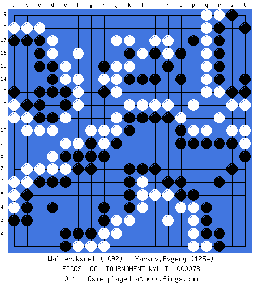 Last move : 0-1 2018 July 21 11:1:24 [Event "FICGS__GO__TOURNAMENT_KYU_I__000078"] [Site "FICGS"] [Date "2018.05.21"] [Round "1"] [Black "Walzer,Karel"] [White "Yarkov,Evgeny"] [Result "0-1"] [Rating 1 "1092"] [Rating 2 "1254"] 1.d4 d16 2.q3 q16 3.r6 k3 4.h3 n3 5.d14 d10 6.c15 r11 7.r9 d7 8.c6 f16 9.c11 c10 10.d11 e11 11.c17 d17 12.c16 c18 13.o16 m17 14.o14 r13 15.p17 j17 16.r17 q17 17.r16 b11 18.c13 q18 19.r15 q15 20.r14 q14 21.r18 p12 22.s13 n12 23.m14 l12 24.m16 n17 25.k16 k17 26.k14 n16 27.n15 l16 28.l14 j13 29.h15 f14 30.h13 j14 31.b12 j15 32.k10 c7 33.d6 b6 34.b5 b7 35.e6 e7 36.e12 d12 37.c12 f12 38.e13 f13 39.k4 l4 40.k5 j3 41.h4 l5 42.k7 l6 43.k6 h2 44.g2 q13 45.o9 s12 46.t14 j2 47.o6 p2 48.q2 p3 49.q4 h10 50.g7 j11 51.m11 m12 52.n11 o11 53.o10 b18 54.b17 b10 55.m7 n5 56.o5 o4 57.g9 g10 58.j9 h9 59.h8 f9 60.g8 r19 61.s19 q19 62.t18 p10 63.p9 q10 64.q9 s10 65.s9 t9 66.t8 t10 67.s7 q1 68.r1 p1 69.r2 g1 70.f2 f1 71.e1 h1 72.e2 k15 73.n6 m5 74.l11 k12 75.f7 e14 76.d13 h14 77.f8 e9 78.d15 e15 79.e8 d8 80.l7 a5 81.b4 a4 82.a3 a6 83.b3 p4 84.p5 a18 85.a17 t12 86.t13 j10 87.k11 a12 88.a13 a11 0-1 Here are the names of the openings (joseki) played in the four corners : Corner d16 : d16 d14 Hoshi (Hwajeom, Seongjeom, Xingwei`) 4-4 Point. The star or hoshi (4-4) point, emphasizing influence at the potential expense of territory. Ikken Takagakari (Hankan Nop'dakeolch'im, Yi Gaojia, 1-Space High Approach). White typically responds at 6-4 or 3-10. White 4-10 is played when White finds play on the right side advantageous. White 4-8 or 3-8 may be played when White has support at top. Player White won this Go (weiqi, baduk) game. Follow this game move after move (download)Stop on second, extend on third. (Anonymous) Methinks King Thibault should dub Marius Zubac a knight of the square board... I mean table, henceforth addressing him as Sir Marius, and bestow on him a suitable land from the kingdom of FICGS & marry him off to a worthy, fair maiden, lest he slice our heads with his mighty sword in his wrath. (Dinesh De Silva)