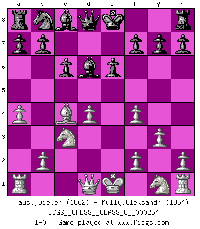 Last move : 1-0 2018 July 5 5:58:1 [Event "FICGS__CHESS__CLASS_C__000254"] [Site "FICGS"] [Date "2018.05.21"] [Round "1"] [White "Faust,Dieter"] [Black "Kuliy,Oleksandr"] [Result "1-0"] [WhiteElo "1862"] [BlackElo "1854"] 1.c4 c6 2.d4 d5 3.Nc3 e6 4.Bf4 dxc4 5.a4 Nf6 6.e3 Nd5 7.Bxc4 Nxf4 8.exf4 Bd6 9.g3 1-0 This chess game has been lost on time (started : 2018.05.21 12:54:22) English : Caro-Kann defensive system Player White won this chess game. Follow this game move after move (download)The passed Pawn is a criminal, who should be kept under lock and key. Mild measures, such as police surveillance, are not sufficient. (Aaron Nimzovich) Der vorletzte Fehler gewinnt. (Savielly Grigorievitsch Tartakower) No soy una persona materialista y por eso, no resiento la falta o pérdida del dinero. La ausencia de cosas mundanas carece de importancia. Ya que el Ajedrez es una forma en la que puedo ser tan materialista como yo desee sin tener la necesidad de vender mi alma. (Jamie Walter Adams) Il vaut mieux sacrifier les pièces de l'adversaire. (Xavier Tartacover) Now you put water in a cup, it becomes the cup; You put water into a bottle it becomes the bottle; You put it in a teapot it becomes the teapot. Water can flow or it can crash. Be water, my friend. (Bruce Lee)
