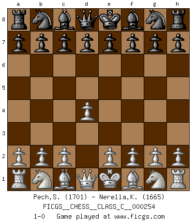 Last move : 1-0 2018 June 30 17:5:29 [Event "FICGS__CHESS__CLASS_C__000254"] [Site "FICGS"] [Date "2018.05.21"] [Round "1"] [White "Pech,Stepan"] [Black "Nerella,Krishna Karthik"] [Result "1-0"] [WhiteElo "1701"] [BlackElo "1665"] 1.d4 1-0 This chess game has been lost on time (started : 2018.05.21 12:54:22) Queen's pawn Player White won this chess game. Follow this game move after move (download)Chess is a part of culture and if a culture is declining then Chess too will decline. (Mikhail Botvinnik) Das Schachspiel hat wie die Liebe, die Musik, die Fähigkeit, den Menschen glücklich zu machen. Ich habe ein leises Gefühl des Bedauerns für jeden, der das Schachspiel nicht kennt, so wie ich jeden bedaure, der die Liebe nicht kennt. (Siegbert Tarrasch) Ser exitoso en el Ajedrez te permite descubrir tu propia personalidad. Eso es lo que deseo para los niños de mi clase. (Saudin Robovic) La guerre est enfant de la passion, la passion est enfant du narcissisme et le narcissisme est l'enfant. (...) Une autre partie ? (Thibault de Vassal) Luck never gives; it only lends. (Swedish proverb)