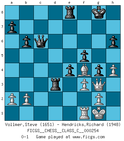 Last move : 0-1 2018 June 24 11:29:42 [Event "FICGS__CHESS__CLASS_C__000254"] [Site "FICGS"] [Date "2018.05.21"] [Round "1"] [White "Vollmer,Steve"] [Black "Hendricks,Richard"] [Result "0-1"] [WhiteElo "1651"] [BlackElo "1948"] 1.d4 Nf6 2.c4 e6 3.Nc3 Bb4 4.Qc2 O-O 5.e4 d5 6.e5 Ne4 7.Nf3 c5 8.Bd3 cxd4 9.Nxd4 Nd7 10.cxd5 exd5 11.Bxe4 dxe4 12.O-O Nxe5 13.Nde2 Bxc3 14.Nxc3 Bf5 15.Bf4 Nd3 16.Rad1 Qd7 17.Qd2 Bg6 18.Qe3 Qc6 19.Rd2 Rad8 20.Ne2 Rfe8 21.Bg3 b6 22.Nf4 Bf5 23.h4 Bg4 24.Ra1 h6 25.Rf1 f6 26.Bh2 g5 27.Qg3 Nxf4 28.Qxg4 Rxd2 29.Bxf4 f5 30.Qg3 Rd3 31.f3 g4 0-1 Nimzo-Indian : Classical variation Kingside Castling by player Black (move 4) Kingside Castling by player White (move 12) Player Black won this chess game. Follow this game move after move (download)Let the perfectionist play postal. (Yasser Seirawan) Der Freibauer hat für mich eine Seele, genau wie der Mensch, Wünsche, die unerkannt in ihm schlummern, und Befürchtungen, von deren Existenz er selbst kaum ahnt. (Aaron Nimzowitsch) Yo jugué Ajedrez con el y a veces le pude haber ganado solo que siempre devuelve su última jugada y juega la partida de manera diferente. (Mark Twain) Une platitude souvent récitée à propos des Echecs est qu'une des choses les plus difficiles à réaliser est de gagner une position gagnante. Cela ne manque pas de sens mais, pour ma part, j'ai toujours trouvé plus difficile de gagner une position perdante. (Tim Krabbe) I feel so... helpless. (C-3PO in Star Wars ep.3)