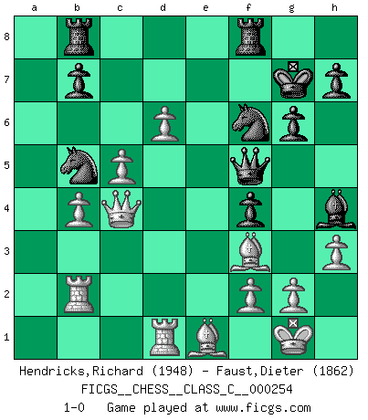 Last move : 1-0 2018 July 1 16:37:0 [Event "FICGS__CHESS__CLASS_C__000254"] [Site "FICGS"] [Date "2018.05.21"] [Round "1"] [White "Hendricks,Richard"] [Black "Faust,Dieter"] [Result "1-0"] [WhiteElo "1948"] [BlackElo "1862"] 1.d4 Nf6 2.c4 g6 3.Nc3 Bg7 4.e4 d6 5.Nf3 Bg4 6.Be2 O-O 7.Be3 Nfd7 8.Rc1 e5 9.d5 a5 10.O-O Na6 11.a3 f5 12.h3 Bxf3 13.Bxf3 f4 14.Bd2 c6 15.Qc2 Ndc5 16.Rb1 Qb6 17.b3 Bf6 18.Ne2 Nd7 19.Rfd1 cxd5 20.exd5 Kg7 21.Nc3 Ndc5 22.Rb2 Bh4 23.Be1 Qd8 24.b4 axb4 25.axb4 Nd7 26.Qe2 Rb8 27.Ne4 Nf6 28.Nxd6 Qxd6 29.c5 Qd7 30.Qxe5 Qf5 31.Qc3 Nc7 32.d6 Nb5 33.Qc4 1-0 King's Indian : 5.Nf3 Kingside Castling by player Black (move 6) Kingside Castling by player White (move 10) Player White won this chess game. Follow this game move after move (download)It's just you and your opponent at the board and you're trying to prove something. (Bobby Fischer) Korrekt heißt in Deutschland die Haltung eines Mannes, dessen Benehmen nach dem Urteile seiner Nachbarn seiner Stellung angemessen ist. Um korrekt zu sein, muß man sich der Meinung der anderen anpassen... (Emanuel Lasker) No existe un remordimiento como el remordimiento del Ajedrez. (H. G. Wells) La solitude du joueur d'Echecs à l'approche du mat est semblable à celle du condamné. (Francis Szpiner) When you've done things right people won't know you've done anything at all. (Futurama)