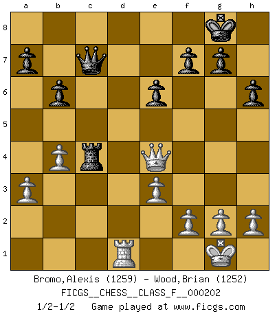 Last move : 1/2-1/2 2018 August 4 14:3:21 [Event "FICGS__CHESS__CLASS_F__000202"] [Site "FICGS"] [Date "2018.05.23"] [Round "1"] [White "Bromo,Alexis"] [Black "Wood,Brian"] [Result "1/2-1/2"] [WhiteElo "1259"] [BlackElo "1252"] 1.d4 Nf6 2.c4 e6 3.a3 d5 4.e3 c6 5.Nc3 Nbd7 6.Nf3 Bd6 7.Be2 O-O 8.O-O c5 9.b3 b6 10.Bb2 Bb7 11.dxc5 Nxc5 12.b4 Nce4 13.Nxe4 Nxe4 14.Bd3 dxc4 15.Bxc4 Rc8 16.Rc1 Qe7 17.Bd3 Rxc1 18.Bxc1 Rc8 19.Bb2 h6 20.Be5 Bxe5 21.Nxe5 Nf6 22.Qb1 Rc3 23.Rd1 Qc7 24.Nc4 Be4 25.Bxe4 Nxe4 26.Qxe4 Rxc4 1/2-1/2 Queen's pawn game Kingside Castling by player Black (move 7) Kingside Castling by player White (move 8) This chess game ended in a draw. Follow this game move after move (download)Chess, like any creative activity, can exist only through the combined efforts of those who have creative talent, and those who have the ability to organize their creative work. (Mikhail Botvinnik) Nicht daß Diemer aus Opportunismus Mitglied der NSDAP geworden wäre. Er war ein Fanatiker, in allem, was er tat. (Hans Ree) El Ajedrez es un invernadero donde los frutos del carácter pueden madurar mas completamente que en la vida. (Edward Morgan Foster) La tactique, c'est ce que vous faites quand il y a quelque chose à faire; la stratégie, c'est ce que vous faites quand il n'y a rien à faire. (Savielli Tartacower) Winning isn't everything... but losing is nothing. (Mednis)