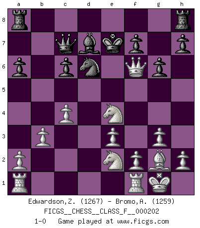 Last move : 1-0 2018 July 29 13:48:25 [Event "FICGS__CHESS__CLASS_F__000202"] [Site "FICGS"] [Date "2018.05.23"] [Round "1"] [White "Edwardson,Zachariah"] [Black "Bromo,Alexis"] [Result "1-0"] [WhiteElo "1267"] [BlackElo "1259"] 1.c4 e5 2.g3 d6 3.Bg2 Nf6 4.Nc3 a6 5.e3 Bd7 6.Bxb7 Ra7 7.Bg2 Nc6 8.Nge2 Bg4 9.Bxc6+ Bd7 10.Bg2 c6 11.b3 g6 12.O-O Bg7 13.d4 exd4 14.Qxd4 Qc7 15.Ne4 Ke7 16.Ba3 Ne8 17.Bxd6+ Nxd6 18.Qxg7 R7a8 19.Qf6+ 1-0 English Opening Kingside Castling by player White (move 12) Player White won this chess game. Follow this game move after move (download)The Pin is mightier than the sword. (Fred Reinfeld) Viele Opfer benötigen überhaupt keine konkrete Berechnung. Es genügt sich die entstehende Position kurz vorzustellen, um uns davon zu überzeugen, dass das Opfer korrekt ist. (Mikhail Nekhemyevich Tal) Las Aperturas te enseñan aperturas. ¡Los Finales te enseñan Ajedrez!. (Stephan Gerzadowicz) Les échecs sont un jeu par leur forme, un art par leur essence et une science par sa difficulté d'acquisition. Ils peuvent vous procurer autant de plaisir qu'un bon livre ou une belle musique, mais vous n'aurez une réelle joie que si vous arrivez à bien jouer. (Tigran Petrosian) Wikichess, chess moves explained by 'experimented' players. (Thibault de Vassal)