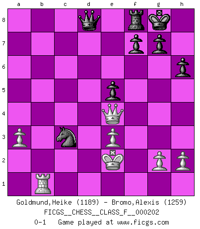 Last move : 0-1 2018 August 1 7:28:57 [Event "FICGS__CHESS__CLASS_F__000202"] [Site "FICGS"] [Date "2018.05.23"] [Round "1"] [White "Goldmund,Heike"] [Black "Bromo,Alexis"] [Result "0-1"] [WhiteElo "1189"] [BlackElo "1259"] 1.b4 e5 2.Bb2 d6 3.Nf3 Nf6 4.e3 a6 5.c4 b5 6.cxb5 axb5 7.Bxb5+ Bd7 8.Bxd7+ Nbxd7 9.O-O Be7 10.Qc2 h6 11.Nh4 Nd5 12.a3 Bxh4 13.d4 c5 14.bxc5 dxc5 15.dxc5 Rc8 16.Rc1 O-O 17.Qe4 Nxc5 18.Qg4 Bxf2+ 19.Kxf2 Nd3+ 20.Ke2 Nxc1+ 21.Bxc1 Rxc1 22.Qe4 Rxb1 23.Rxb1 Nc3+ 0-1 Polish (Sokolsky) opening Kingside Castling by player White (move 9) Kingside Castling by player Black (move 16) Player Black won this chess game. Follow this game move after move (download)The older I grow, the more I value pawns. (Paul Keres) Es ist peinlich, dass ich nie Weltmeister wurde. Es wäre leicht, Leonid Breschnjew als Ursache vorzuschieben, dessen Apparat den Vorzeigekommunisten Anatoli Karpow in allem unterstützte. Aber Garri Kasparow zum Beispiel, der ebenfalls von den Sowjets unerwünscht war, hat trotz der Widerstände den WM-Titel erobert. (Viktor Kortschnoi) Fischer es el jugador mas fuerte del mundo. De hecho, el jugador mas fuerte que jamas haya existido. (Larry Evans) Si rien de grave n'est détecté lors de l'analyse d'une position, on joue alors le coup. Seconde règle de Blumenfeld. The only sure thing about luck is that it will change. (Wilson Mizner)