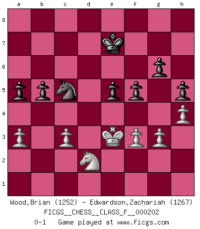 Last move : 0-1 2018 September 27 5:4:14 [Event "FICGS__CHESS__CLASS_F__000202"] [Site "FICGS"] [Date "2018.05.23"] [Round "1"] [White "Wood,Brian"] [Black "Edwardson,Zachariah"] [Result "0-1"] [WhiteElo "1252"] [BlackElo "1267"] 1.e4 c6 2.d4 d5 3.Nc3 dxe4 4.Nxe4 Bf5 5.Ng3 Bg6 6.Nf3 Nf6 7.h4 h5 8.Ne5 Bh7 9.c3 e6 10.Bd3 Bxd3 11.Qxd3 Nbd7 12.Bf4 Nd5 13.Bg5 Nxe5 14.dxe5 Be7 15.Bxe7 Nxe7 16.Qxd8+ Rxd8 17.O-O Ng6 18.Rad1 Nxe5 19.Rxd8+ Kxd8 20.Rd1+ Kc7 21.b3 g6 22.f3 Rd8 23.Rxd8 Kxd8 24.Ne4 Ke7 25.Kf2 Nd7 26.Ke3 f5 27.Nd2 e5 28.g3 b5 29.b4 c5 30.bxc5 Nxc5 31.a3 a5 0-1 Caro-Kann : Classical variation Kingside Castling by player White (move 17) Player Black won this chess game. Follow this game move after move (download)Morphy was probably the greatest genius of them all. (Bobby Fischer) Gewöhnliche Menschen denken nur daran, wie sie ihre Zeit verbringen. Ein intelligenter Mensch versucht, sie auszunutzen. (Arthur Schopenhauer) Tu sabes que vas a perder. Aún cuando tenía la ventaja, yo sabía que iba a perder. - al estar jugando con Fischer (Andrew Soltis) Je menace de comprendre la position. (Anonyme) Excelling at chess has long been considered a symbol of more general intelligence. That is an incorrect assumption in my view, as pleasant as it might be. But for the purposes of argument and investigation, chess is, in Russkin-Gutman's words, 'an unparalleled laboratory, since both the learning process and the degree of ability obtained can be objectified and quantified, providing an excellent comparative framework on which to use rigorous analytical techniques.' (The Chess Master and the Computer, by Garry Kasparov - 2010)