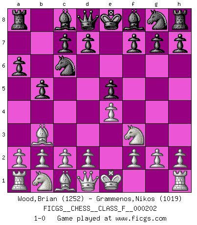 Last move : 1-0 2018 July 7 6:35:6 [Event "FICGS__CHESS__CLASS_F__000202"] [Site "FICGS"] [Date "2018.05.23"] [Round "1"] [White "Wood,Brian"] [Black "Grammenos,Nikos"] [Result "1-0"] [WhiteElo "1252"] [BlackElo "1019"] 1.e4 e5 2.Nf3 Nc6 3.Bb5 a6 4.Ba4 b5 5.Bb3 1-0 This chess game has been lost on time (started : 2018.05.23 7:37:36) Ruy Lopez : Caro variation Player White won this chess game. Follow this game move after move (download)A win by an unsound combination, however showy, fills me with artistic horror. (Wilhelm Steinitz) Sehr viele beherrschen heutzutage das große Einmalseins des Schachspiels und kennen sogar dessen Logarithmentafeln auswendig - deshalb sollte man hin und wieder zu beweisen trachten, dass zwei mal zwei auch fünf sein kann. (Mikhail Nekhemyevich Tal) El Ajedrez es el arte del análisis. (Mikhail Botvinnik) Le joueur d'Echecs qui veut atteindre le top est obligé de développer son propre credo créatif. Alexeï Stepanovicth Souétine. Il est facile d'écrire des livres ! Ce qui est difficile, c'est de jouer ! (Alexeï Stepanovicth Souétine) Watch your thoughts; they become words. Watch your words; they become actions. Watch your actions; they become habits. Watch your habits; they become character. Watch your character; it becomes your destiny. (Frank Outlaw)