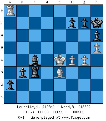 Last move : 0-1 2018 July 6 9:4:23 [Event "FICGS__CHESS__CLASS_F__000202"] [Site "FICGS"] [Date "2018.05.23"] [Round "1"] [White "Leurette,Marc-Antoine"] [Black "Wood,Brian"] [Result "0-1"] [WhiteElo "1234"] [BlackElo "1252"] 1.e4 e5 2.Nf3 Nc6 3.Bc4 Bc5 4.Nc3 Nf6 5.O-O h6 6.d3 O-O 7.Qe2 Nd4 8.Nxd4 Bxd4 9.Be3 Bxc3 10.bxc3 c6 11.Bb3 b6 12.Qf3 d6 13.d4 Qe7 14.c4 exd4 15.Bxd4 Qxe4 16.Qxe4 Nxe4 17.f3 Nd2 18.Rf2 Nxb3 19.cxb3 c5 20.Bc3 Be6 21.Rd1 Rfd8 22.g4 d5 23.cxd5 Rxd5 24.Re1 Rad8 25.h3 Rd3 26.Be5 Rd1 27.Rxd1 Rxd1+ 28.Kg2 b5 29.f4 Bd5+ 30.Kg3 Rd3+ 31.Kh2 c4 32.bxc4 Bxc4 33.h4 Ra3 34.Rd2 Rxa2 35.Bb2 a5 36.Kg3 a4 37.Rd8+ Kh7 38.Bc1 Rc2 39.Be3 Rc3 40.Kf3 b4 41.h5 a3 42.Ke4 a2 43.Ra8 b3 0-1 Giuoco Piano : Four knights variation Kingside Castling by player White (move 5) Kingside Castling by player Black (move 6) Player Black won this chess game. Follow this game move after move (download)First-class players lose to second-class players because second-class players sometimes play a first-class game. (Siegbert Tarrasch) Schach ist Kampf, hauptsächlich jedoch gegen die eigenen Fehler. (Savielly Grigorievitsch Tartakower) Yo jugué Ajedrez con el y a veces le pude haber ganado solo que siempre devuelve su última jugada y juega la partida de manera diferente. (Mark Twain) Plusieurs personnes se sont demandées comment Tal faisait pour gagner... En fait, c'est très simple ! Il met ses pièces au centre de l'échiquier et les sacrifie quelque part ! (David Bronstein) If computers get too powerful, we can organize them into committees. That'll do them in. (Anonymous)