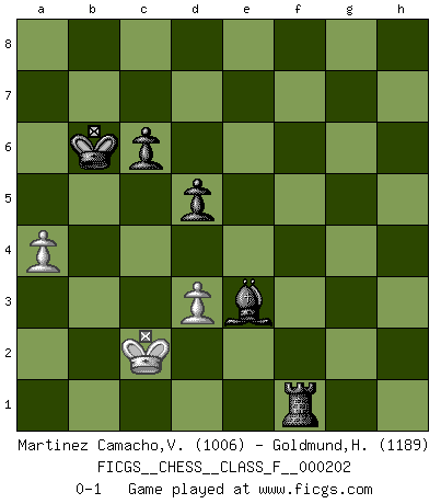 Last move : 0-1 2018 August 29 13:32:37 [Event "FICGS__CHESS__CLASS_F__000202"] [Site "FICGS"] [Date "2018.05.23"] [Round "1"] [White "Martinez Camacho,Victor Hugo"] [Black "Goldmund,Heike"] [Result "0-1"] [WhiteElo "1006"] [BlackElo "1189"] 1.e4 d5 2.exd5 Qxd5 3.d4 Nf6 4.Nc3 Qa5 5.Bd2 c6 6.Ne4 Qc7 7.Nxf6+ gxf6 8.Bc4 Bf5 9.Nf3 Nd7 10.Nh4 Bg6 11.Nxg6 hxg6 12.g3 e6 13.Qe2 Nb6 14.Bb3 O-O-O 15.O-O-O Rxd4 16.Be3 Rxd1+ 17.Rxd1 Rxh2 18.Qf3 Bg7 19.a4 Nd5 20.Bxd5 exd5 21.Bf4 Qb6 22.b3 Rxf2 23.Qg4+ Kd8 24.Qh4 g5 25.Qh7 Qc5 26.Bd2 Bf8 27.Qxf7 Be7 28.Qe6 Qd6 29.Qg8+ Kd7 30.Qg6 Qxg3 31.Qd3 Qxd3 32.cxd3 f5 33.b4 f4 34.Rg1 g4 35.Rxg4 Bd6 36.b5 f3 37.Rg7+ Kc8 38.bxc6 bxc6 39.Rxa7 Bc5 40.Ra8+ Kb7 41.Rh8 Ba3+ 42.Kc2 Bb4 43.Rh7+ Kb6 44.Kb3 Bxd2 45.Rf7 Be3 46.Kc3 Rf1 47.Rf5 f2 48.Kb2 Re1 49.Kc2 f1Q 50.Rxf1 Rxf1 0-1 Scandinavian (centre counter) defense Queenside Castling by player Black (move 14) Queenside Castling by player White (move 15) 10 pieces endgame at move 44 : White KRPP , Black KRBPPP WHITE : King + 1 Rook 2 Pawns BLACK : King + 1 Rook 1 Bishop 3 Pawns Promotion Queen by player Black (move 49) 9 pieces endgame at move 50 : White KRPP , Black KRBPP WHITE : King + 1 Rook 2 Pawns BLACK : King + 1 Rook 1 Bishop 2 Pawns 8 pieces endgame at move 50 : White KPP , Black KRBPP WHITE : King + 2 Pawns BLACK : King + 1 Rook 1 Bishop 2 Pawns Player Black won this chess game. Follow this game move after move (download)You know, comrade Pachman, I don't enjoy being a Minister, I would rather play Chess like you. (Che Guevara) Ein typischer, sehr verbreiteter Gedankenschädling ist der, daß der betreffende Amateur von der Annanhme ausgeht, daß jeder einzelne Zug etwas zu leisten habe. (Aaron Nimzowitsch) Cuando me preguntan: -¿Cual es el secreto que te hace hacer mejores movidas que tus oponentes?, Yo respondo: Me da gusto que me pregunten eso, porque, como veran, hay una simple razón. Yo pienso mis propias movidas y dejo a mi oponente que el piense las suyas. (Alexander Alekhine) La solitude du joueur d'Echecs à l'approche du mat est semblable à celle du condamné. (Francis Szpiner) Either move or be moved. (Ezra Pound)