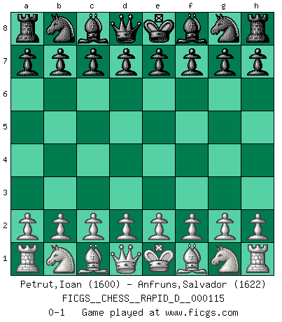 Last move : 0-1 2018 June 25 4:1:42 [Event "FICGS__CHESS__RAPID_D__000115"] [Site "FICGS"] [Date "2018.05.26"] [Round "1"] [White "Petrut,Ioan"] [Black "Anfruns,Salvador"] [Result "0-1"] [WhiteElo "1600"] [BlackElo "1622"] 0-1 This chess game has been lost on time (started : 2018.05.26 3:17:29) Player Black won this chess game. Follow this game move after move (download)Why must I lose to this idiot ? (Aron Nimzovich) Es gibt zwei Arten von Opfern: Korrekte und meine. (Mikhail Nekhemyevich Tal) Sin errores no puede haber brillantez. (Emanuel Lasker) Mais l'homme est une créature légère et illogique : semblable au joueur d'échecs, il n'aime que le processus du but à atteindre, non le but lui-même. (Dostoïevsky) A specialist learns more and more about less and less until he knows everything about nothing. (Nicholas Murray Butler)