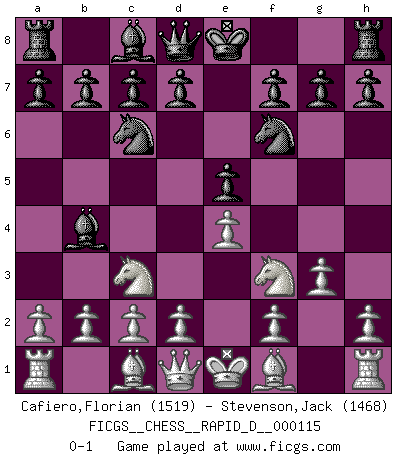 Last move : 0-1 2018 July 9 7:5:1 [Event "FICGS__CHESS__RAPID_D__000115"] [Site "FICGS"] [Date "2018.05.26"] [Round "1"] [White "Cafiero,Florian"] [Black "Stevenson,Jack"] [Result "0-1"] [WhiteElo "1519"] [BlackElo "1468"] 1.e4 e5 2.Nf3 Nc6 3.Nc3 Nf6 4.g3 Bb4 0-1 This chess game has been lost on time (started : 2018.05.26 3:17:29) Four knights game Player Black won this chess game. Follow this game move after move (download)When I asked Fischer why he had not played a certain move in our game, he replied: 'Well, you laughed when I wrote it down !' (Mikhail Tal) Alles was ich jemals tun will ist Schach spielen. (Robert James Fischer) Por esta medida (el intervalo entre Fischer y sus contemporaneos), yo le considero el mas grande campeón mundial. (Garry Kasparov) L'action d'une oeuvre littéraire se déroule sur un champ de bataille. Les masques et les types du drame moderne correspondent aux pièces du jeu d'échecs. L'intrigue correspond aux coups et aux gambits, c'est à dire aux techniques du jeu telles qu'utilisées et interprétées par les joueurs. Les tactiques et les péripéties [mouvements] correspondent aux coups exécutés par l'adversaire. (Viktor Shklovsky) The hypothalamus is one of the most important parts of the brain, involved in many kinds of motivation, among other functions. The hypothalamus controls the 'Four Fs: Fighting, Fleeing, Feeding and Mating. (Unknown author)