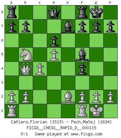 Last move : 0-1 2018 October 9 7:23:29 [Event "FICGS__CHESS__RAPID_D__000115"] [Site "FICGS"] [Date "2018.05.26"] [Round "1"] [White "Cafiero,Florian"] [Black "Pech,Matej"] [Result "0-1"] [WhiteElo "1519"] [BlackElo "1634"] 1.e4 c5 2.Nf3 Nc6 3.d4 cxd4 4.Nxd4 Nf6 5.Nc3 e5 6.Ndb5 d6 7.Nd5 Nxd5 8.exd5 Ne7 9.c4 Ng6 10.Qa4 Bd7 11.Qb4 Bf5 12.Be2 Be7 13.Bg5 Nf4 14.Bxf4 exf4 15.O-O O-O 0-1 This chess game has been lost on time (started : 2018.05.26 3:17:29) Sicilian : Pelikan (Lasker/Sveshnikov) variation Kingside Castling by player White (move 15) Kingside Castling by player Black (move 15) Player Black won this chess game. Follow this game move after move (download)All that matters on the Chessboard is good moves. (Bobby Fischer) Je mehr ich von der FIDE weiss, um so weniger verstehe ich. (Alexander Kalifman) Juega la Apertura como un libro, el Juego Medio como un mago y los Finales como una máquina. (Spielmann) Les écrivains ont utilisé les échecs pour analyser les côtés extrêmes de la nature humaine. Dans ce cadre, les échecs offrent un champ d'expérimentation idéal. Mais on pourrait faire la même chose avec la peinture. Et là, en vous référant à Van Gogh, vous ne tirerez pas de conclusion définitive sur les peintres. (Gary Kasparov) I don't believe in psychology. I believe in good moves. (Bobby Fischer)