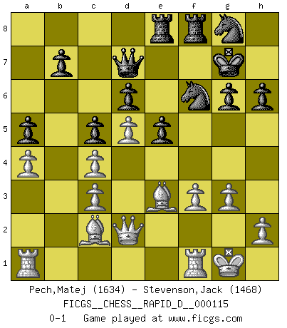 Last move : 0-1 2018 September 22 15:3:58 [Event "FICGS__CHESS__RAPID_D__000115"] [Site "FICGS"] [Date "2018.05.26"] [Round "1"] [White "Pech,Matej"] [Black "Stevenson,Jack"] [Result "0-1"] [WhiteElo "1634"] [BlackElo "1468"] 1.d4 Nf6 2.c4 e6 3.Nc3 Bb4 4.e3 c5 5.Bd3 Nc6 6.Nf3 Bxc3+ 7.bxc3 d6 8.O-O e5 9.Nd2 O-O 10.d5 Ne7 11.Qc2 g6 12.e4 Nh5 13.g3 f5 14.exf5 Bxf5 15.Ne4 Bxe4 16.Bxe4 Kg7 17.Bg5 Qd7 18.Qd2 Ng8 19.f3 h6 20.Be3 Nhf6 21.Bc2 Rae8 22.a4 a5 0-1 This chess game has been lost on time (started : 2018.05.26 3:17:29) Nimzo-Indian : e3, Huebner variation Kingside Castling by player White (move 8) Kingside Castling by player Black (move 9) Player Black won this chess game. Follow this game move after move (download)Alekhine is a poet who creates a work of art out of something that would hardly inspire another man to send home a picture post card. (Max Euwe) Ich glaube, ich kenne inzwischen die Gründe für mein Versagen: schachliche Charakterfehler. Ich war nie ein Wunderkind und in meiner gesamten menschlichen Entwicklung immer zu langsam. (Viktor Kortschnoi) Yo no le temo a Spassky. Todos saben que yo soy el mejor. Uno no necesita un torneo para probarlo. (Bobby Fischer) La tactique est l'élément le plus important du milieu de jeu. (Siegbert Tarrasch) If you don't practice you don't deserve to win. (Andre Agassi)