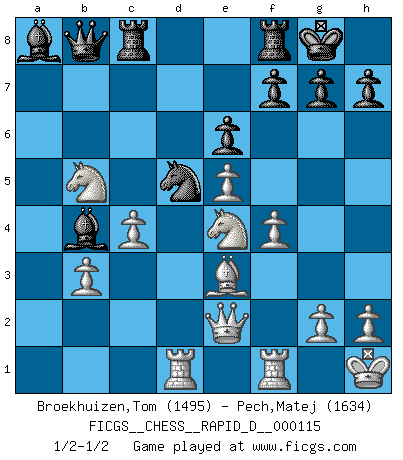 Last move : 1/2-1/2 2018 September 6 4:19:27 [Event "FICGS__CHESS__RAPID_D__000115"] [Site "FICGS"] [Date "2018.05.26"] [Round "1"] [White "Broekhuizen,Tom"] [Black "Pech,Matej"] [Result "1/2-1/2"] [WhiteElo "1495"] [BlackElo "1634"] 1.e4 c5 2.Nf3 e6 3.Be2 Nc6 4.d4 cxd4 5.Nxd4 Nf6 6.Nc3 d6 7.Be3 Be7 8.Qd2 O-O 9.O-O a6 10.f4 Qc7 11.a4 Bd7 12.Nb3 Nb4 13.Rad1 Be8 14.Bf3 d5 15.e5 Nd7 16.Nd4 Nc5 17.b3 Rc8 18.Nce2 Ne4 19.Bxe4 dxe4 20.Ng3 Bc6 21.Kh1 b5 22.axb5 axb5 23.c3 Nd5 24.Nxe4 Ba8 25.Nxb5 Qb8 26.c4 Bb4 27.Qe2 1/2-1/2 Sicilian defense Kingside Castling by player Black (move 8) Kingside Castling by player White (move 9) This chess game ended in a draw. Follow this game move after move (download)In Fischer's hands, a slight theoretical advantage is as good a being a Queen ahead. (Isaac Kashdan) Es ist schade, dass viele Schachsportler vergessen, wie wichtig Auftreten und angemessene Kleidung sind. (Alexandra Kosteniuk) Los errores estan ahí, esperando a que se cometan. (Savielly Tartakower) Le temps de noter son nom sur la feuille de partie, j'étais déjà en zeitnot ! D'un modeste amateur apparié lors de la première ronde d'un open contre le grand-maître Azmaïparashvili. Establishing goals is all right if you don't let them deprive you of interesting detours. (Doug Larson)