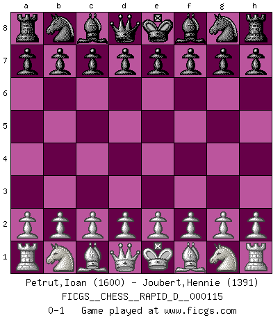 Last move : 0-1 2018 June 25 4:1:42 [Event "FICGS__CHESS__RAPID_D__000115"] [Site "FICGS"] [Date "2018.05.26"] [Round "1"] [White "Petrut,Ioan"] [Black "Joubert,Hennie"] [Result "0-1"] [WhiteElo "1600"] [BlackElo "1391"] 0-1 This chess game has been lost on time (started : 2018.05.26 3:17:29) Player Black won this chess game. Follow this game move after move (download)Some part of a mistake is always correct. (Savielly Tartakover) Der Traum, für den ich lebe, ist der von einem freien Russland. Viele mögen sagen: Russland hat doch ein Parlament, einen gewählten Präsidenten. Aber ich spüre, dass in meiner Heimat die Angst wiederkehrt. Eine Angst, sich frei zu äußern, bestimmte Dinge zu tun (Garry Kasparov) El jugador táctico sabe que hacer cuando hay algo que hacer; mientras que el estratega sabe que hacer cuando no hay nada que hacer. (Gerald Abrahams) 'L'échange des dames est un coup dur pour les deux adversaires...' Un journaliste lors d'une partie du match Spassky-Fischer SEO proverb : Make your website optimized for human beings, not for search engines.