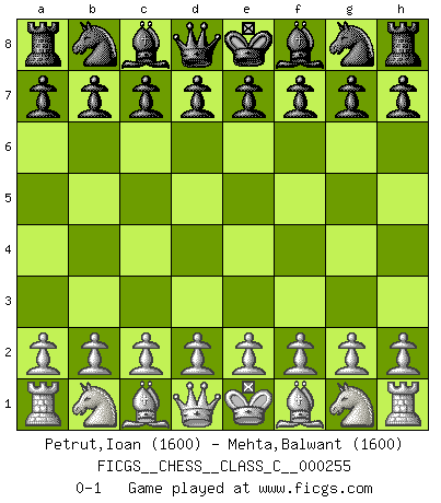 Last move : 0-1 2018 July 6 18:9:44 [Event "FICGS__CHESS__CLASS_C__000255"] [Site "FICGS"] [Date "2018.05.27"] [Round "1"] [White "Petrut,Ioan"] [Black "Mehta,Balwant"] [Result "0-1"] [WhiteElo "1600"] [BlackElo "1600"] 0-1 This chess game has been lost on time (started : 2018.05.27 12:56:6) Player Black won this chess game. Follow this game move after move (download)Chess opens and enriches your mind. (Saudin Robovic) Zeige mir drei Eröffnungsvarianten und ich beweise dir, dass zwei davon inkorrekt sind. (Emanuel Lasker) Puntos débiles o agujeros en la posición de tu oponente deben de ser ocupados por piezas, no Peones. (Siegbert Tarrasch) Des combinaisons [dans le jeu d'échecs] pareilles à des mélodies. Je crois entendre pour ainsi dire la musique des coups... (Vladimir Nabokov) Gambling is the son of avarice and the father of despair. (French proverb)