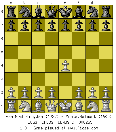 Last move : 1-0 2018 July 6 18:9:44 [Event "FICGS__CHESS__CLASS_C__000255"] [Site "FICGS"] [Date "2018.05.27"] [Round "1"] [White "Van Mechelen,Jan"] [Black "Mehta,Balwant"] [Result "1-0"] [WhiteElo "1737"] [BlackElo "1600"] 1.e4 1-0 This chess game has been lost on time (started : 2018.05.27 12:56:6) King's pawn Opening Player White won this chess game. Follow this game move after move (download)The chessboard is the world, the pieces are the phenomena of the Universe, the rules of the game are what we call the laws of Nature and the player on the other side is hidden from us. (Thomas Huxley) Der Umstand, daß uns eine 7 Stunden Zeitkontrolle ermöglicht eine großartige, tiefe Partie zu spielen, ist für die Massenmedien nicht weiter von Bedeutung. (Alexej Shirov) Un jugador que es sorprendido, esta derrotado a medias. (Proverbio) Le jeu d'échecs est comme rejeté hors du temps. (Antoine de Saint-Exupéry) The right perception of any matter and a misunderstanding of the same matter do not wholly exclude each other. (Kafka's the trial)