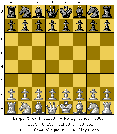 Last move : 0-1 2018 July 6 18:9:44 [Event "FICGS__CHESS__CLASS_C__000255"] [Site "FICGS"] [Date "2018.05.27"] [Round "1"] [White "Lippert,Karl"] [Black "Romig,James"] [Result "0-1"] [WhiteElo "1600"] [BlackElo "1967"] 0-1 This chess game has been lost on time (started : 2018.05.27 12:56:6) Player Black won this chess game. Follow this game move after move (download)Chess is played with the mind and not with the hands ! (Renaud and Kahn) Wir können eben der zündenden Macht des Opfers nicht wiederstehen, denn die Begeisterung für das Opfer liegt in der Natur des Menschen. (Rudolf Spielmann) Cualquier cambio de material en una posición debe venir por medio de un mate, una captura o promoción de Peón. (Purdy) Aux échecs, les retours au sommet sont rares : les dommages psychologiques consécutifs à une défaite sont trop sévères. (Daily Telegraph) Cactus - It is depressed cucumber. (Ilmars Cirulis)