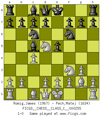 Last move : 1-0 2018 July 30 8:46:10 [Event "FICGS__CHESS__CLASS_C__000255"] [Site "FICGS"] [Date "2018.05.27"] [Round "1"] [White "Romig,James"] [Black "Pech,Matej"] [Result "1-0"] [WhiteElo "1967"] [BlackElo "1634"] 1.c4 e5 2.Nf3 Nc6 3.Nc3 Nf6 4.g3 Bb4 5.Nd5 Bc5 6.Bg2 1-0 This chess game has been lost on time (started : 2018.05.27 12:56:6) English, Nimzovich variation Player White won this chess game. Follow this game move after move (download)Good positions don't win games, good moves do. (Gerald Abrahams) Kein Großmeister ist normal. Sie unterscheiden sich nur im Ausmaß Ihrer Verrücktheit. (Viktor Kortschnoi) El juego de Damas es para vagabundos. (Paul Morphy) En blitz, le Cavalier l'emporte sur le Fou. (Vlastimil Hort) 'preceded by its own quotation yields a falsehood' preceded by its own quotation yields a falsehood. (W. V. O. Quine - Set Theory And Its Logic, 1953)