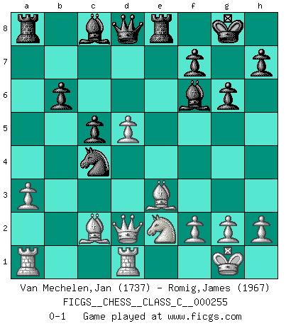 Last move : 0-1 2018 June 17 12:25:47 [Event "FICGS__CHESS__CLASS_C__000255"] [Site "FICGS"] [Date "2018.05.27"] [Round "1"] [White "Van Mechelen,Jan"] [Black "Romig,James"] [Result "0-1"] [WhiteElo "1737"] [BlackElo "1967"] 1.e4 Nf6 2.e5 Nd5 3.d4 d6 4.c4 Nb6 5.exd6 exd6 6.Nc3 Be7 7.Bd3 Nc6 8.Nge2 O-O 9.O-O Re8 10.b3 a5 11.Be3 Nb4 12.Bb1 a4 13.a3 axb3 14.Qxb3 Nc6 15.Qc2 g6 16.Nd5 Nxd5 17.cxd5 Na5 18.Qc3 c5 19.dxc5 dxc5 20.Bc2 b6 21.Rfd1 Bf6 22.Qd2 Nc4 0-1 Alekhine's defense : Exchange variation Kingside Castling by player Black (move 8) Kingside Castling by player White (move 9) Player Black won this chess game. Follow this game move after move (download)There are two classes of men; those who are content to yield to circumstances and who play whist; those who aim to control circumstances, and who play Chess. (Mortimer Collins) Fischer machte Schach einfach zu einer aufregenden Sache, wann immer er sich ans Brett setzte. (Raymond Keene) Uno no tiene que jugar muy bien, es suficiente jugar mejor que el oponente. (Siegbert Tarrasch) Les Echecs ne sont pas pour les âmes timides. Ils requièrent un homme entier, qui ne s'arrête pas aveuglément à ce qui a été déjà établi, mais qui tente individuellement de sonder les profondeurs du jeu. (W. Steinitz) Every now and then a man's mind is stretched by a new idea and never shrinks back to its former dimensions. (Oliver Wendell Holmes, Sr.)