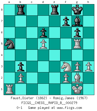 Last move : 0-1 2018 June 25 16:23:32 [Event "FICGS__CHESS__RAPID_B__000279"] [Site "FICGS"] [Date "2018.05.28"] [Round "1"] [White "Faust,Dieter"] [Black "Romig,James"] [Result "0-1"] [WhiteElo "1862"] [BlackElo "1967"] 1.c4 Nf6 2.Nc3 g6 3.g3 c5 4.Bg2 Nc6 5.Nf3 Bg7 6.O-O O-O 7.d4 d6 8.d5 Na5 9.Qd3 a6 10.e4 Rb8 11.e5 Ng4 12.exd6 exd6 13.Re1 b5 14.cxb5 axb5 15.Bg5 Qb6 16.h3 Nf6 17.Qd2 b4 18.Ne4 Nxe4 19.Rxe4 Bf5 20.Rf4 h6 21.Rxf5 hxg5 22.Rxg5 c4 23.Qe2 Rfe8 24.Qc2 b3 25.axb3 Qxb3 26.Qxb3 cxb3 0-1 English Opening Kingside Castling by player White (move 6) Kingside Castling by player Black (move 6) Player Black won this chess game. Follow this game move after move (download)Dazzling combinations are for the many, shifting wood is for the few. (Georg Kieninger) Schach ist das schnellste Spiel der Welt, weil man in jeder Sekunde Tausende von Gedanken ordnen muß. (Albert Einstein) El Ajedrez es tortura mental. (Garry Kasparov) Si le désir cupide (et stupide) de gagner est une inépuisable source de souffrance, une combinaison brillante sur l'échiquier est une découverte : le coquelicot qui s'épanouit lorsque apparaît la Voie Lactée. (Arrabal) The arrogant army will lose certainly the battle. (Chinese proverb)