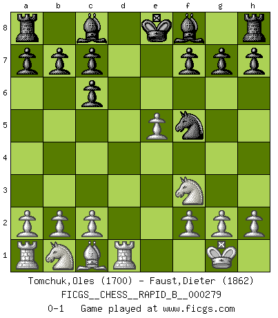 Last move : 0-1 2018 August 14 10:11:14 [Event "FICGS__CHESS__RAPID_B__000279"] [Site "FICGS"] [Date "2018.06.30"] [Round "1"] [White "Tomchuk,Oles"] [Black "Faust,Dieter"] [Result "0-1"] [WhiteElo "1700"] [BlackElo "1862"] 1.e4 e5 2.Nf3 Nc6 3.Bb5 Nf6 4.O-O Nxe4 5.d4 Nd6 6.Bxc6 dxc6 7.dxe5 Nf5 8.Qxd8+ Kxd8 9.Rd1+ Ke8 0-1 This chess game has been lost on time (started : 2018.06.30 0:10:4) Ruy Lopez : Berlin defense, Open variation Kingside Castling by player White (move 4) Player Black won this chess game. Follow this game move after move (download)When you are lonely, when you feel yourself an alien in the world, play Chess. This will raise your spirits and be your counselor in war. (Aristotle) Wie bekannt hörte Morphy 1859 auf, Schach zu spielen. Seine Enttäuschung galt nicht so sehr dem Schach, wie den Schachspielern. (Robert James Fischer) El Ajedrez es tan interesante por sí solo, que no es necesario un interés monetario para persuadir a una persona a que lo practique; por lo tanto, nunca se juega por dinero. (Benjamin Franklin) On peut tirer plus d'utilité d'une partie perdue que de 100 parties gagnées. (Capablanca) In God we trust, all others we virus scan. (Anonymous)