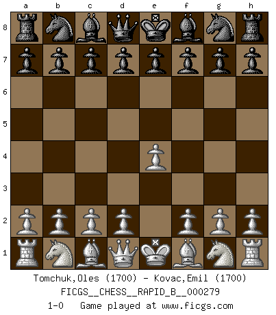 Last move : 1-0 2018 July 30 20:50:26 [Event "FICGS__CHESS__RAPID_B__000279"] [Site "FICGS"] [Date "2018.06.30"] [Round "1"] [White "Tomchuk,Oles"] [Black "Kovac,Emil"] [Result "1-0"] [WhiteElo "1700"] [BlackElo "1700"] 1.e4 1-0 This chess game has been lost on time (started : 2018.06.30 0:10:4) King's pawn Opening Player White won this chess game. Follow this game move after move (download)The way he plays Chess demonstrates a man's whole nature. (Stanley Ellin) Ich verachte die Medien. (Robert James Fischer) El jugador de combinación piensa hacia adelante; comienza de la posición dada y trabaja las movidas contundentes en su mente. (Emanuel Lasker) Aux échecs, l'amour-propre est satisfait quand on remporte la victoire, mais il n'y a pas de honte à être battu. (Benjamin Franklin) Wisdom begins at the end. (Daniel Webster)