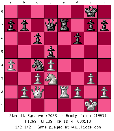 Last move : 1/2-1/2 2018 June 12 0:8:40 [Event "FICGS__CHESS__RAPID_A__000218"] [Site "FICGS"] [Date "2018.05.30"] [Round "1"] [White "Sternik,Ryszard"] [Black "Romig,James"] [Result "1/2-1/2"] [WhiteElo "2023"] [BlackElo "1967"] 1.e4 Nf6 2.Nc3 d5 3.exd5 Nxd5 4.Nf3 Bf5 5.d4 Nb4 6.Bb5+ c6 7.Ba4 e6 8.O-O Be7 9.a3 Nd5 10.Nxd5 exd5 11.Re1 O-O 12.Bf4 Nd7 13.c3 Nb6 14.Bc2 Bxc2 15.Qxc2 Bd6 16.Bxd6 Qxd6 17.Re2 Rae8 18.Rae1 Rxe2 19.Rxe2 f6 20.Ne1 Rf7 21.Nd3 Re7 22.g3 Nc4 23.a4 Qd7 1/2-1/2 Alekhine's defense : Scandinavian variation Kingside Castling by player White (move 8) Kingside Castling by player Black (move 11) This chess game ended in a draw. Follow this game move after move (download)Chess is life. (Bobby Fischer) Ein Kibitz ist einer, der deinem Gegner gute Ratschläge gibt. (Andrew Soltis) Alekhine es un poeta que crea un trabajo de arte de algo que raramente inspiraría a otra persona a mandar una tarjeta postal. (Max Euwe) Si je n'étais pas joueur d'échecs, je serais le meilleur dans quelque chose d'autre. (Anatoli Karpov) In my experience, there's no such thing as luck. (Obi-Wan Kenobi in Star Wars ep.4)