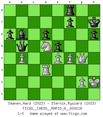 Last move : 1-0 2018 June 25 22:14:57 [Event "FICGS__CHESS__RAPID_A__000218"] [Site "FICGS"] [Date "2018.05.30"] [Round "1"] [White "Daanen,Aard"] [Black "Sternik,Ryszard"] [Result "1-0"] [WhiteElo "2023"] [BlackElo "2023"] 1.e4 c5 2.Nf3 d6 3.d4 cxd4 4.Nxd4 Nf6 5.Nc3 a6 6.Be3 e5 7.Nf3 Be7 8.Bc4 O-O 9.O-O Nc6 10.Bb3 Be6 11.Qe2 Na5 12.Rfd1 Nxb3 13.axb3 Qc7 14.Bg5 Rac8 15.Rd3 h6 16.Bxf6 Bxf6 17.Rad1 Be7 18.R1d2 Qa5 19.Qd1 Rfe8 20.h3 g6 21.Nd5 Bd8 22.h4 Kh7 23.b4 Qb5 24.b3 Rf8 25.c4 Qe8 26.Nc3 Be7 27.b5 Rc5 28.bxa6 bxa6 29.Ra2 Qc6 30.Nd2 Rb8 31.h5 gxh5 32.Qxh5 Rg8 33.Nd5 Bd8 34.b4 Rxc4 35.Nxc4 Qxc4 36.Qe2 Bg4 37.f3 Bc8 38.Rc2 Qb5 39.Rxc8 Bb6+ 40.Kh2 Rxc8 41.f4 Rf8 42.Qg4 1-0 Sicilian : Najdorf, Byrne (English) attack Kingside Castling by player Black (move 8) Kingside Castling by player White (move 9) Player White won this chess game. Follow this game move after move (download)It's just you and your opponent at the board and you're trying to prove something. (Bobby Fischer) Darum geht es im Schach. Einen Tag gibst du deinem Gegner eine Lektion, am nächsten Tag gibt er dir eine. (Robert James Fischer) Fischer deseaba darle a los Rusos una sopa de su propia medicina. (Larry Evans) Le moment que je préfère le plus dans une rencontre, c'est celui où je sens que la personnalité de l'adversaire se brise. (Robert Fischer) It's not the size of the dog in the fight, it's the size of the fight in the dog. (Mark Twain)