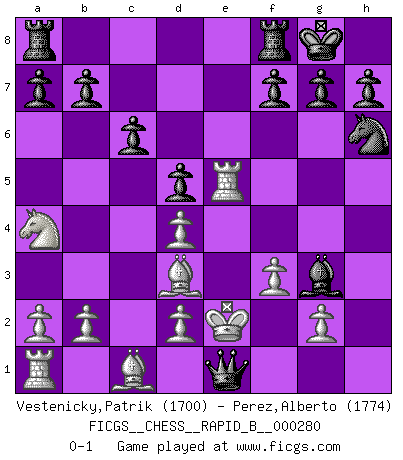 Last move : 0-1 2018 June 16 0:59:7 [Event "FICGS__CHESS__RAPID_B__000280"] [Site "FICGS"] [Date "2018.05.30"] [Round "1"] [White "Vestenicky,Patrik"] [Black "Perez,Alberto"] [Result "0-1"] [WhiteElo "1700"] [BlackElo "1774"] 1.e3 d5 2.Nf3 Nf6 3.c4 e6 4.Bd3 Nc6 5.cxd5 exd5 6.O-O Bd6 7.Re1 O-O 8.Nc3 Bg4 9.Nd4 Bxd1 10.Rxd1 Nxd4 11.exd4 Ng4 12.f3 Bxh2 13.Kf1 Nh6 14.Re1 Bg3 15.Re2 c6 16.Re5 Qh4 17.Ke2 Qh1 18.Na4 Qe1 0-1 Van't Kruijs Opening Kingside Castling by player White (move 6) Kingside Castling by player Black (move 7) Player Black won this chess game. Follow this game move after move (download)Chess, like love, like music, has the power to make people happy. (Siegbert Tarrasch) Als ich elf wurde, wurde ich einfach gut. (Robert James Fischer) Fischer no está bajo la obligación de nadie. (Joseph Platz) La tactique, c'est ce que vous faites quand il y a quelque chose à faire; la stratégie, c'est ce que vous faites quand il n'y a rien à faire. (Savielli Tartacower) I don't believe in psychology. I believe in good moves. (Bobby Fischer)