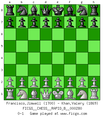 Last move : 0-1 2018 June 30 5:5:48 [Event "FICGS__CHESS__RAPID_B__000280"] [Site "FICGS"] [Date "2018.05.30"] [Round "1"] [White "Francisco,Jimwell"] [Black "Khan,Valery"] [Result "0-1"] [WhiteElo "1700"] [BlackElo "1869"] 0-1 This chess game has been lost on time (started : 2018.05.30 20:4:1) Player Black won this chess game. Follow this game move after move (download)Dazzling combinations are for the many, shifting wood is for the few. (Georg Kieninger) Wer nie einen Fehler gemacht hat, hat nie etwas Neues ausprobiert. (Albert Einstein) Si pudieramos observar el interior de la cabeza de un jugador de Ajedrez, encontraríamos ahí un mundo lleno de sentimientos, imágenes, ideas, emoción y pasión. (Alfred Binet) C'est une question de caractère, Beaucoup de gens perdent leur motivation très vite. D'autres, ils sont rares, peuvent la conserver très longtemps. J'aime les échecs, encore aujourd'hui je suis heureux d'analyser des parties. J'aime toujours gagner, je déteste encore perdre. Bien jouer est important pour mon intégrité intellectuelle et morale. Et puis les échecs vivent en ce moment une période historique grâce à Internet. Ils se développent dans les systèmes éducatifs à travers le monde. Ils sortent de leur ghetto, et c'est mon rôle de mener à bien cette révolution. (Gary Kasparov) Those who make the worst use of their time are the first to complain of its brevity. (Jean de la Bruyere)