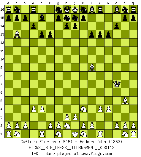 Last move : 1-0 2018 July 22 23:27:58 [Event "FICGS__BIG_CHESS__TOURNAMENT__000112"] [Site "FICGS"] [Date "2018.05.30"] [Round "1"] [White "Cafiero,Florian"] [Black "Hadden,John"] [Result "1-0"] [WhiteElo "1515"] [BlackElo "1253"] 1.m2-m4 e15-e13 2.n2-n4 m15-m13 3.d2-d4 d15-d14 4.j2-k4 f15-f13 5.h1-o7 c16-d15 6.e2-e4 o15-o14 7.f1-c4 l15-l13 8.c4-g8 n15-n13 9.g8-b13 d15-b13 10.o1-b13 e16-d16 11.c1-l9 f16-e15 12.l1-p5 1-0 Follow this game move after move (download)Everything is in a state of flux, and this includes the world of Chess. (Mikhail Botvinnik) Die starken Figuren des Gegners muss man abtauschen. (José Raúl Capablanca) El Ajedrez lo es todo: arte, ciencia y deporte. (Anatoly Karpov) Dieu déplace le joueur, et celui-ci la pièce. Quel Dieu derrière Dieu commence donc la trame ? Arturo Perez-Reverte (prix de littérature policière 1993). The best weapon against an enemy is another enemy. (Friedrich Nietzsche)