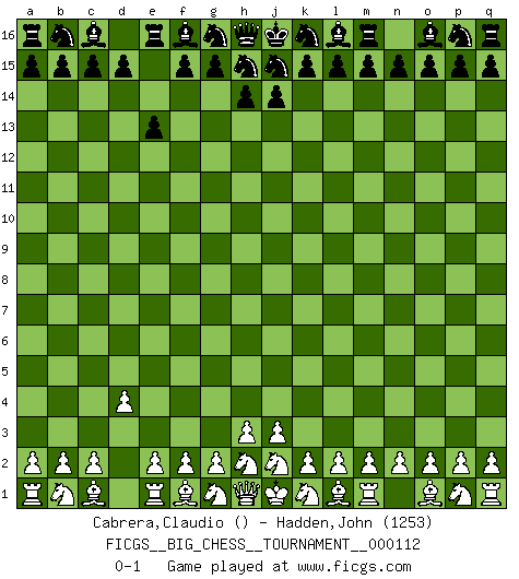 Last move : 0-1 2018 June 1 23:4:39 [Event "FICGS__BIG_CHESS__TOURNAMENT__000112"] [Site "FICGS"] [Date "2018.05.30"] [Round "1"] [White "Cabrera,Claudio"] [Black "Hadden,John"] [Result "0-1"] [WhiteElo ""] [BlackElo "1253"] 1.d2-d4 e15-e13 0-1 Follow this game move after move (download)Chess is really ninety nine percent calculation. (Soltis) Vom Schach wurde gesagt das Leben sei dafür nicht lange genug. Aber das ist der Fehler des Lebens, nicht des Schach'. (Irving Chernev) Una buena ofensiva y una buena defensa, comienzan ambas con un buen desarrollo. (Bruce A. Moon) Des idées, des idées, j'en ai cent, j'en ai mille. Des bonnes, des mauvaises, applicables, irréalisables... Il suffit de faire le tri ! (Roos) Happy endings are just stories that haven't finished yet. (Jane Smith in Mr & Mrs Smith)