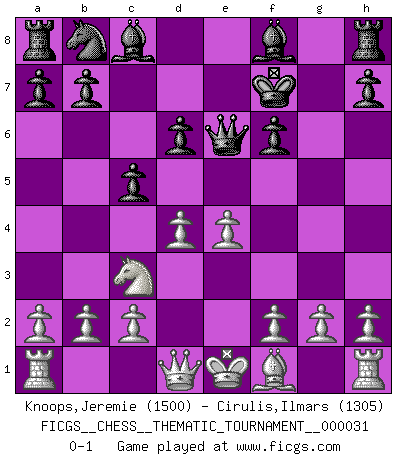 Last move : 0-1 2007 July 4 21:49:28 [Event "FICGS__CHESS__THEMATIC_TOURNAMENT__000031"] [Site "FICGS"] [Date "2007.05.08"] [Round "1"] [White "Knoops,Jeremie"] [Black "Cirulis,Ilmars"] [Result "0-1"] [WhiteElo "1500"] [BlackElo "1305"] 1.e4 e5 2.Nf3 Nf6 3.Nxe5 d6 4.Nxf7 Kxf7 5.d4 c5 6.Nc3 Qe7 7.Bg5 Qe6 8.Bxf6 gxf6 0-1 This chess game has been lost on time (started : 2007.05.08 13:27:12) Petrov : Cochrane gambit Player Black won this chess game. Follow this game move after move (download)Openings teach you openings. Endgames teach you chess ! (Stephan Gerzadowicz) Kombinieren und Schwarzhandel gehören verboten. (Savielly Grigorievitsch Tartakower) ¡Examina movidas que hagan daño! Un buen ojo for movidas desvastantes es mucho mas importante que el conocimiento de principios estratégicos. (Purdy) Si rien de grave n'est détecté lors de l'analyse d'une position, on joue alors le coup. Seconde règle de Blumenfeld. I've never seen so many men wasted so badly. (Blondie in The Good, The Bad and The Ugly)