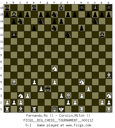 Last move : 0-1 2018 August 6 21:38:9 [Event "FICGS__BIG_CHESS__TOURNAMENT__000112"] [Site "FICGS"] [Date "2018.05.30"] [Round "1"] [White "Fernando,Ro"] [Black "Corolin,Mitch"] [Result "0-1"] [WhiteElo ""] [BlackElo ""] 1.j2-k4 b16-c14 2.b1-c3 b15-b14 3.g1-f3 c16-b15 4.k1-l3 j15-h13 5.e2-e4 h16-o10 6.h3-h4 o10-o2 7.p1-q3 o2-o13 8.f1-d3 k16-l14 9.g2-g4 g16-f14 10.f3-g5 m15-m13 11.n2-n4 p16-o14 12.e4-e5 o13-n13 13.f2-f4 e15-e13 14.o1-l4 l16-p12 15.h4-h5 f16-b12 16.m2-m3 n13-j9 17.g5-h7 j9-j11 18.l1-p5 j11-j12 19.d3-b5 j12-j13 20.d2-d3 l14-k12 21.p5-q6 b12-k4 22.h2-j4 k4-b12 23.l3-m5 j13-j4 24.l4-k3 j4-g4 0-1 This big chess game has been lost on time (started : 2018.05.30 20:7:30) Follow this game move after move (download)Your body has to be in top condition. Your Chess deteriorates as your body does. You can't separate body from mind. (Bobby Fischer) Mit Schach schule ich mein Gefühl für Geometrie, was für Tennis und Schach gleichermaßen wichtig ist. (Boris Becker) Vive, pierde y aprende al observar a tu oponente como ganar. (Amber Steenbock) On n'a jamais que l'âge auquel on a commence à jouer aux échecs car après on cesse de vieillir. (Capablanca) Beep ! (R2D2 in Star Wars ep.3)