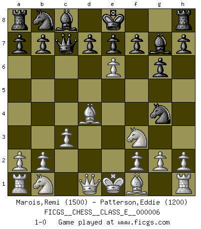 Last move : 1-0 2006 July 23 14:38:13 [Event "FICGS__CHESS__CLASS_E__000006"] [Site "FICGS"] [Date "2006.06.07"] [Round "1"] [White "Marois,Remi"] [Black "Patterson,Eddie"] [Result "1-0"] [WhiteElo "1500"] [BlackElo "1200"] 1.e4 c5 2.Nf3 g6 3.d4 Bg7 4.dxc5 Qa5+ 5.c3 Qxc5 6.Be3 Qc7 7.Bd4 Nf6 8.e5 Ng4 9.e6 1-0 This chess game has been lost on time (started : 2006.06.07 19:52:39) Sicilian : Hungarian variation Player White won this chess game. Follow this game move after move (download)Chess is above all, a fight ! (Emanuel Lasker) Nie in meinem Leben habe ich die französische Verteidigung gespielt, welche die Stumpfsinnigste von allen ist. (Wilhelm Steinitz) Me gusta decir que Bobby Fischer fue el mejor jugador que jamás haya existido. Pero lo que hizo de Fischer un genio, fue su habilidad de mezclar una frescura y pragmatismo Americano con ideas Rusas acerca de la estrategia. (Bruce Pandolfini) Les Cavaliers se révèlent fort utiles dans les positions fermées. D'habitude, les Fous sont un peu plus forts que les Cavaliers dans les positions ouvertes. Qu'on le veuille ou non, il restera toujours des exceptions ! Luck never made a man wise. (Seneca, Letters to Lucilius)