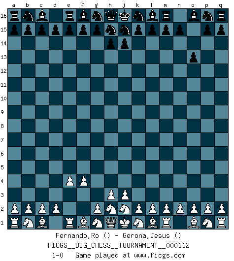 Last move : 1-0 2018 June 17 16:40:32 [Event "FICGS__BIG_CHESS__TOURNAMENT__000112"] [Site "FICGS"] [Date "2018.05.30"] [Round "1"] [White "Fernando,Ro"] [Black "Gerona,Jesus"] [Result "1-0"] [WhiteElo ""] [BlackElo ""] 1.e2-e4 o15-o13 2.f2-f4 1-0 Follow this game move after move (download)What is the difference between chess and football? Everybody understands football, but nobody plays it. Everybody plays chess, but nobody understands it. Everything is relative. (Vladimir Kramnik) Es gibt zwei Arten von Opfern: Korrekte und meine. (Mikhail Nekhemyevich Tal) Todos los jugadores de Ajedrez deberían tener un pasatiempo. (Savielly Tartakower) Une platitude souvent récitée à propos des Echecs est qu'une des choses les plus difficiles à réaliser est de gagner une position gagnante. Cela ne manque pas de sens mais, pour ma part, j'ai toujours trouvé plus difficile de gagner une position perdante. (Tim Krabbe) Crush them ! Make them suffer ! (General Grievous in Star Wars ep.3)