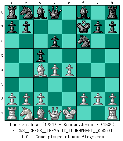 Last move : 1-0 2007 July 27 0:49:4 [Event "FICGS__CHESS__THEMATIC_TOURNAMENT__000031"] [Site "FICGS"] [Date "2007.05.08"] [Round "1"] [White "Carrizo,Jose"] [Black "Knoops,Jeremie"] [Result "1-0"] [WhiteElo "1724"] [BlackElo "1500"] 1.e4 e5 2.Nf3 Nf6 3.Nxe5 d6 4.Nxf7 Kxf7 5.d4 c5 6.Bc4+ 1-0 This chess game has been lost on time (started : 2007.05.08 13:27:12) Petrov : Cochrane gambit Player White won this chess game. Follow this game move after move (download)Fischer, who may or may not be mad as a hatter, has every right to be horrified. (Jeremy Silman) Wer sich die Fähigkeit anerziehen will im Schach selbstständig zu denken, der muß alles meiden, was leblos ist: ausgeklügelte Theorien, die sich auf sehr wenige Beispiele und eine Menge Hirngespinste stützen. (Emanuel Lasker) Los tropiezos estan todos ahí en el tablero, esperando que se cometan. (Savielly Tartakover) J'ai vu le vaincu d'Echecs jouer des années durant dans l'espoir de la fête de la victoire. Car tu es plus riche de ce qu'elle existe si même elle n'est point pour toi. Ainsi de la perle du fond des mers. (Antoine de Saint-Exupéry) There is a computer disease that anybody who works with computers knows about. It's a very serious disease and it interferes completely with the work. The trouble with computers is that you 'play' with them ! (Richard P. Feynman)