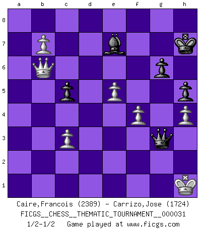 Last move : 1/2-1/2 2008 February 24 4:17:18 [Event "FICGS__CHESS__THEMATIC_TOURNAMENT__000031"] [Site "FICGS"] [Date "2007.05.08"] [Round "1"] [White "Caire,Francois"] [Black "Carrizo,Jose"] [Result "1/2-1/2"] [WhiteElo "2389"] [BlackElo "1724"] 1.e4 e5 2.Nf3 Nf6 3.Nxe5 d6 4.Nxf7 Kxf7 5.d4 c5 6.dxc5 Nc6 7.Bc4+ Be6 8.Bxe6+ Kxe6 9.O-O Kf7 10.Qe2 Qe8 11.Re1 d5 12.e5 Ne4 13.Nc3 Nxc3 14.Qf3+ Kg8 15.Qxc3 Qe6 16.b4 h6 17.Rb1 Kh7 18.f4 a6 19.Qd3+ g6 20.Be3 Bg7 21.c3 Rhf8 22.Rbd1 Rad8 23.Rf1 Ne7 24.Rf2 Nf5 25.Bd4 Rf7 26.a3 Rdf8 27.Rdf1 Ne7 28.h3 h5 29.h4 Qf5 30.Qf3 a5 31.g3 axb4 32.axb4 Ra8 33.Kg2 R7f8 34.Rd2 Ra3 35.Rc1 Rfa8 36.Qe2 R8a4 37.R1c2 Nc6 38.Bf2 Qe6 39.Ra2 Bf8 40.b5 Ne7 41.c6 bxc6 42.b6 d4 43.Rxa3 Rxa3 44.Rxd4 Nf5 45.Rd3 Be7 46.b7 Rb3 47.Qa2 Qc4 48.Kh2 Qxd3 49.Qxb3 Qe2 50.Qb6 c5 51.Kg1 Ne3 52.Bxe3 Qxe3+ 53.Kh1 Qxg3 1/2-1/2 Petrov : Cochrane gambit Kingside Castling by player White (move 9) This chess game ended in a draw. Follow this game move after move (download)Before the endgame, the Gods have placed the middle game. (Siegbert Tarrasch) Die Jungen erwarten, dass Opa einfach umfällt. Dann aber kann Opa fünf Stunden lang Schach spielen und die jungen Gegner an die Wand drücken. (Viktor Kortschnoi) En posiciones complicadas, Bobby Fischer pocas veces tuvo que temer de cualquiera. (Paul Keres) A ce moment-là, je menaçais de comprendre la position ! (Clément L'Heureux) Be who you are, and say what you feel because those who mind don't matter, and those who matter don't mind. (Dr Seuss)