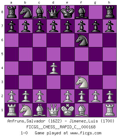 Last move : 1-0 2018 July 2 17:37:2 [Event "FICGS__CHESS__RAPID_C__000168"] [Site "FICGS"] [Date "2018.05.31"] [Round "1"] [White "Anfruns,Salvador"] [Black "Jimenez,Luis"] [Result "1-0"] [WhiteElo "1622"] [BlackElo "1700"] 1.Nf3 Nf6 2.d4 1-0 This chess game has been lost on time (started : 2018.05.31 16:15:17) Reti Opening Player White won this chess game. Follow this game move after move (download)Spassky will not be psyched out by Fischer. (Mike Goodall) Wenn ich Weiß habe gewinne ich weil ich Weiß habe, wenn ich Schwarz habe gewinne ich weil ich Bogoljubov bin. (Efim Bogoljubov) La última cosa en que Fischer estaba interesado era en tonterías, siempre y cuando el Ajedrez estuviera involucrado. (Elie Agur) Les échecs, c'est l'art d'analyser. (Mikhail Botvinnik) Memory is a way of holding onto the things you love, the things you are, the things you never want to lose. (from the television show: The Wonder Years)