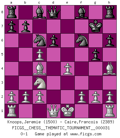 Last move : 0-1 2007 August 3 7:55:52 [Event "FICGS__CHESS__THEMATIC_TOURNAMENT__000031"] [Site "FICGS"] [Date "2007.05.08"] [Round "1"] [White "Knoops,Jeremie"] [Black "Caire,Francois"] [Result "0-1"] [WhiteElo "1500"] [BlackElo "2389"] 1.e4 e5 2.Nf3 Nf6 3.Nxe5 d6 4.Nxf7 Kxf7 5.d4 c5 6.Nc3 g6 7.dxc5 Nc6 8.Bc4+ Kg7 9.Bg5 h6 10.Bh4 g5 0-1 This chess game has been lost on time (started : 2007.05.08 13:27:12) Petrov : Cochrane gambit Player Black won this chess game. Follow this game move after move (download)All Chess players should have a hobby. (Savielly Tartakower) Gegen einen Schachcomputer zu verlieren ist wie Löcher in den Strümpfen zuhaben. Es ist nicht peinlich, solange man der einzige ist der es weiß. (Anonymous) El arma más poderosa en el Ajedrez, es tener la próxima movida. (David Bronstein) Plusieurs personnes se sont demandées comment Tal faisait pour gagner... En fait, c'est très simple ! Il met ses pièces au centre de l'échiquier et les sacrifie quelque part ! (David Bronstein) If we knew what we were doing, we would not call it research. (Albert Einstein)