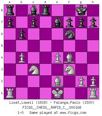 Last move : 1-0 2018 July 17 7:54:47 [Event "FICGS__CHESS__RAPID_C__000168"] [Site "FICGS"] [Date "2018.05.31"] [Round "1"] [White "Liwat,Lowell"] [Black "Falanga,Paolo"] [Result "1-0"] [WhiteElo "1818"] [BlackElo "1500"] 1.d4 Nf6 2.c4 e6 3.a3 d5 4.f3 Be7 5.Nc3 Nbd7 6.c5 O-O 7.e4 e5 8.b4 exd4 9.Qxd4 dxe4 10.fxe4 Re8 11.Be2 b6 12.c6 Ne5 13.Qxd8 Rxd8 14.Bf4 Nxc6 15.Nf3 Nxb4 16.axb4 1-0 This chess game has been lost on time (started : 2018.05.31 16:15:17) Queen's pawn game Kingside Castling by player Black (move 6) Player White won this chess game. Follow this game move after move (download)When I asked Fischer why he had not played a certain move in our game, he replied: 'Well, you laughed when I wrote it down !' (Mikhail Tal) Im Leben werden Partien nie so unstrittig gewonnen wie im Spiel (Emanuel Lasker) No es tiempo de jugar al Ajedrez cuando la casa esta en llamas. (Proverbio Italiano) Aucun coup ne doit être joué sans but. (Pedro Damiano) Unless in communicating with it one says exactly what one means, trouble is bound to result. (Alan Turing, about computers)