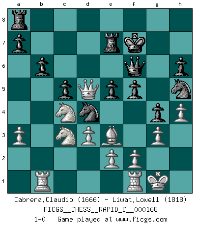 Last move : 1-0 2018 June 9 5:10:0 [Event "FICGS__CHESS__RAPID_C__000168"] [Site "FICGS"] [Date "2018.05.31"] [Round "1"] [White "Cabrera,Claudio"] [Black "Liwat,Lowell"] [Result "1-0"] [WhiteElo "1666"] [BlackElo "1818"] 1.Nf3 c5 2.c4 Nc6 3.Nc3 e5 4.d3 d6 5.g3 h6 6.Bg2 g5 7.Be3 f5 8.h4 g4 9.Nd2 Nf6 10.O-O Be6 11.a3 Nh5 12.Bd5 Qf6 13.b4 Bxd5 14.cxd5 Nd4 15.Qa4+ Kf7 16.Rab1 b6 17.bxc5 dxc5 18.Nc4 Bd6 19.Qd7+ Be7 20.d6 Rhe8 21.dxe7 Rxe7 22.Qd5+ 1-0 Reti Opening Kingside Castling by player White (move 10) Player White won this chess game. Follow this game move after move (download)Good positions don't win games, good moves do. (Gerald Abrahams) Alle offensichtlichen Züge sehen nach dem Spiel in der Analyse verdächtig aus. (Viktor Kortschnoi) Existen dos clases de sacrificios: los correctos y los míos. (Mikhail Tal) Le joueur d'Echecs qui veut atteindre le top est obligé de développer son propre credo créatif. Alexeï Stepanovicth Souétine. Il est facile d'écrire des livres ! Ce qui est difficile, c'est de jouer ! (Alexeï Stepanovicth Souétine) Whoever said the pen is mightier than the sword obviously never encountered automatic weapons. (US General Douglas MacArthur)