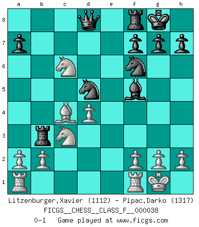 Last move : 0-1 2007 May 29 9:57:58 [Event "FICGS__CHESS__CLASS_F__000038"] [Site "FICGS"] [Date "2007.05.09"] [Round "1"] [White "Litzenburger,Xavier"] [Black "Pipac,Darko"] [Result "0-1"] [WhiteElo "1112"] [BlackElo "1317"] 1.e4 e5 2.Nf3 Nc6 3.Bc4 Nf6 4.c3 Bc5 5.d4 exd4 6.cxd4 Bb4+ 7.Bd2 d5 8.Bxb4 Nxb4 9.exd5 Bf5 10.O-O O-O 11.Nc3 c6 12.dxc6 bxc6 13.Qb3 Nbd5 14.Ne5 Rb8 15.Nxc6 Rxb3 0-1 Two knights defense Kingside Castling by player White (move 10) Kingside Castling by player Black (move 10) Player Black won this chess game. Follow this game move after move (download)There must have been a time when men were demigods, or they could not have invented Chess. (Gustav Schenk) Nicht daß Diemer aus Opportunismus Mitglied der NSDAP geworden wäre. Er war ein Fanatiker, in allem, was er tat. (Hans Ree) La mitad de las variaciones que son calculadas en una partida de torneo, resultan ser completamente superfluas. Desafortunadamente, nadie sabe por adelantado cual mitad. (Jan Tinman) Même si vous avez un bon coup à faire, regardez toujours s'il n'y en a pas un qui lui soit préférable. (Pedro Damiano) If only people were all showed a certain minimum level of niceness; if only people didn't retract verbal draw offers (without draw box ticked) on ficgs; if only people didn't kill; if only people didn't run concentration / extermination camps, if only people didn't drop nuclear bombs on Hiroshima and Nagasaki, and so on - it would be a much more beautiful world. But sadly, things are not so... (Normajean Yates)