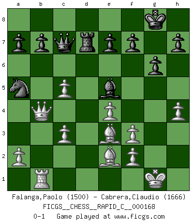 Last move : 0-1 2018 July 29 20:43:20 [Event "FICGS__CHESS__RAPID_C__000168"] [Site "FICGS"] [Date "2018.05.31"] [Round "1"] [White "Falanga,Paolo"] [Black "Cabrera,Claudio"] [Result "0-1"] [WhiteElo "1500"] [BlackElo "1666"] 1.d4 Nf6 2.c4 g6 3.Nc3 d5 4.cxd5 Nxd5 5.e4 Nxc3 6.bxc3 Bg7 7.Nf3 c5 8.Bc4 O-O 9.Be3 Bg4 10.O-O Nc6 11.dxc5 Qa5 12.Qb3 Bxf3 13.gxf3 Qc7 14.Rab1 Na5 15.Qb4 Be5 16.h4 Rfd8 17.Be2 Rd7 18.Rfd1 Rad8 19.Rxd7 Rxd7 0-1 This chess game has been lost on time (started : 2018.05.31 16:15:17) King's Indian defense, 3.Nc3 Kingside Castling by player Black (move 8) Kingside Castling by player White (move 10) Player Black won this chess game. Follow this game move after move (download)Help your pieces so they can help you. (Paul Morphy) Viele Opfer benötigen überhaupt keine konkrete Berechnung. Es genügt sich die entstehende Position kurz vorzustellen, um uns davon zu überzeugen, dass das Opfer korrekt ist. (Mikhail Nekhemyevich Tal) Mi estilo es algo parecido entre un poco de Tal y Petrosian. (Reshevsky) Demandez au pauvre Cg1 ce qu'il en pense. Eduard Gufeld à propos de la variante Saemisch de l'Est-Indienne. A shortcut is the longest distance between two points. (Don Groves)