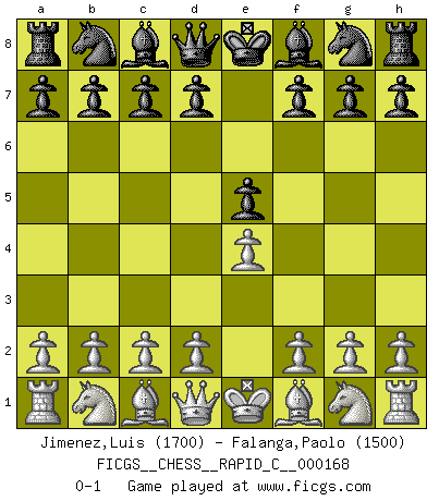 Last move : 0-1 2018 July 2 5:37:26 [Event "FICGS__CHESS__RAPID_C__000168"] [Site "FICGS"] [Date "2018.05.31"] [Round "1"] [White "Jimenez,Luis"] [Black "Falanga,Paolo"] [Result "0-1"] [WhiteElo "1700"] [BlackElo "1500"] 1.e4 e5 0-1 This chess game has been lost on time (started : 2018.05.31 16:15:17) King's pawn game Player Black won this chess game. Follow this game move after move (download)By playing at Chess then, we may learn: First: Foresight... Second: Circumspection... Third: Caution... And lastly, we learn by Chess the habit of not being discouraged by present bad appearances in the state of our affairs, the habit of hoping for a favorable chance, and that of persevering in the secrets of resources. (Benjamin Franklin) Moralische Siege zählen nicht. (Savielly Grigorievitsch Tartakower) El ganador de una partida es aquel jugador que hace el penúltimo error. (Savielly Tartakover) Nous vivons dans un monde échiquéen : chaque jour qui passe est un défi à relever. (Philosophe Sasha) You know what they say : You lie down with the Devil, you wake up in Hell. (Horatio Caine, C.S.I. Miami)