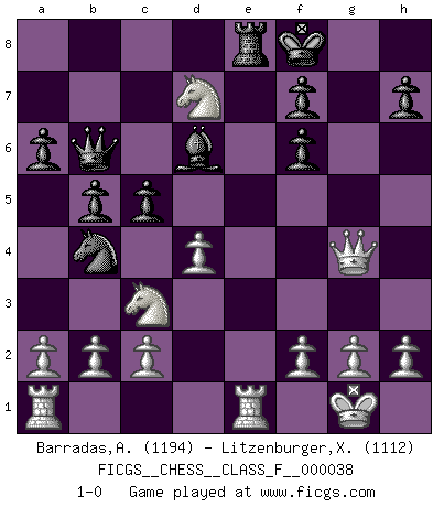 Last move : 1-0 2007 May 16 21:0:9 [Event "FICGS__CHESS__CLASS_F__000038"] [Site "FICGS"] [Date "2007.05.09"] [Round "1"] [White "Barradas,Anderson"] [Black "Litzenburger,Xavier"] [Result "1-0"] [WhiteElo "1194"] [BlackElo "1112"] 1.e4 e5 2.Nf3 Nc6 3.Bb5 Nf6 4.d3 a6 5.Ba4 b5 6.Bb3 d5 7.O-O Bc5 8.Bg5 O-O 9.Bxd5 Nb4 10.Bxa8 Be6 11.Bd5 Bxd5 12.exd5 Qxd5 13.Nc3 Qd7 14.Nxe5 Qd6 15.Re1 Qb6 16.Be3 Re8 17.d4 Bd6 18.Bg5 c5 19.Bxf6 gxf6 20.Qg4+ Kf8 21.Nd7+ 1-0 Ruy Lopez : Berlin defense Kingside Castling by player White (move 7) Kingside Castling by player Black (move 8) Player White won this chess game. Follow this game move after move (download)Dazzling combinations are for the many, shifting wood is for the few. (Georg Kieninger) Schach ist das Spiel, das die Verrückten gesund hält. (Albert Einstein) Las Aperturas te enseñan aperturas. ¡Los Finales te enseñan Ajedrez!. (Stephan Gerzadowicz) Le plus grand jeu de l'esprit jamais inventé, plus vous l'apprenez, plus vous y prenez du plaisir. (Garry Kasparov) At last I discovered the true beauty of chess. So I proposed to her. (Dinesh De Silva)