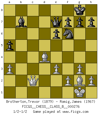 Last move : 1/2-1/2 2018 September 26 2:40:4 [Event "FICGS__CHESS__CLASS_B__000276"] [Site "FICGS"] [Date "2018.05.31"] [Round "1"] [White "Brotherton,Trevor"] [Black "Romig,James"] [Result "1/2-1/2"] [WhiteElo "1879"] [BlackElo "1967"] 1.Nf3 Nf6 2.b3 d5 3.Bb2 c5 4.g3 e6 5.Bg2 Nc6 6.O-O Be7 7.d4 O-O 8.e3 b5 9.dxc5 Bxc5 10.Nbd2 Rb8 11.a3 a5 12.Ra2 Be7 13.Qa1 Ba6 14.Rc1 Qd7 15.c4 bxc4 16.bxc4 dxc4 17.Nxc4 Rfc8 18.Nce5 Nxe5 19.Nxe5 Rxc1+ 20.Qxc1 Qd6 21.Bd4 Rc8 22.Nc6 Bb7 23.Nxe7+ Qxe7 24.Rc2 Rxc2 25.Qxc2 1/2-1/2 Reti Opening Kingside Castling by player White (move 6) Kingside Castling by player Black (move 7) This chess game ended in a draw. Follow this game move after move (download)He who takes the Queen's Knight's Pawn will sleep in the streets. (Anonymous) Ich könnte leicht behaupten: Ja,ja, Leonid Breschnew wollte nicht, daß ich Weltmeister werde. In der Tat war die Sache komplizierter. (Viktor Kortschnoi) La única cosa que los jugadores de Ajedrez tienen en común, es el Ajedrez. (Lodewijk Prins) Si le désir cupide (et stupide) de gagner est une inépuisable source de souffrance, une combinaison brillante sur l'échiquier est une découverte : le coquelicot qui s'épanouit lorsque apparaît la Voie Lactée. (Arrabal) Big Chess is a place for big hallucinations. (Thibault de Vassal)
