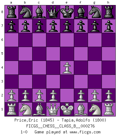 Last move : 1-0 2018 July 11 7:14:6 [Event "FICGS__CHESS__CLASS_B__000276"] [Site "FICGS"] [Date "2018.05.31"] [Round "1"] [White "Price,Eric"] [Black "Tapia,Adolfo"] [Result "1-0"] [WhiteElo "1845"] [BlackElo "1800"] 1.e4 1-0 This chess game has been lost on time (started : 2018.05.31 16:17:26) King's pawn Opening Player White won this chess game. Follow this game move after move (download)A man that will take back a move at Chess will pick a pocket. (Richard Fenton) Heutzutage gewinnt im Turnier nicht derjenige Spieler, der weitreichende Pläne entwirft, sondern einfach jener, der Zug um Zug kämpft. (David Bronstein) Si no le temes a Spassky, entonces elimino el elemento del dinero. (Jim Slater) Echiquier : carré parfait, comme la Jérusalem nouvelle décrite par l'auteur de l'Apocalypse, huit cases sur huit, exaltation du chiffre 4, symbole du cosmos aux quatre horizons... où le noir et le blanc, l'ombre et la lumière, le mal et le bien s'entremêlent et se conjuguent. (Robert Couffignal, Le Gambit du poète) Statistics can be made to prove anything - even the truth. (Author unknown)